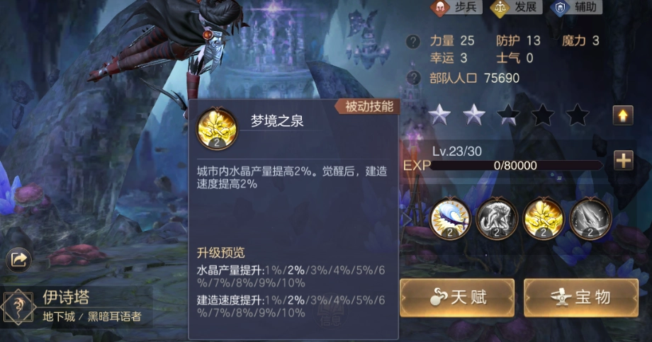 还有一位是我们的紫色英雄伊诗塔,这也是个相对容易获取的英雄。玩家可以适度升级解锁其能够加快建筑速度的被动天赋,借此加速建筑升级进程,对于新手而言,它是性价比超高的英雄。