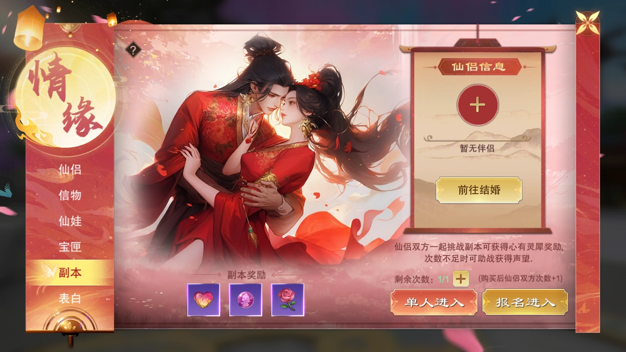 和仙侣携手挑战副本,不但可提升彼此间的默契与情谊,还能收获“心有灵犀”奖励。