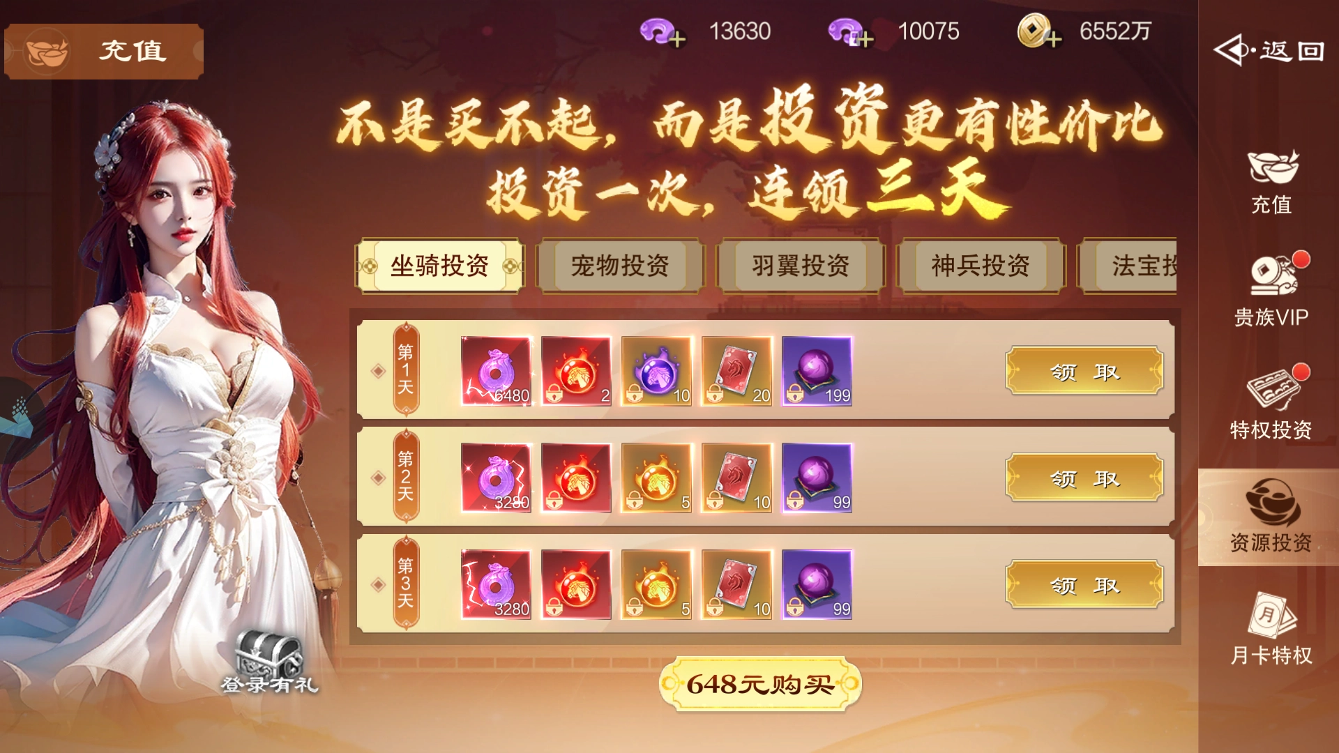 游戏中,坐骑、宠物、羽翼、神兵、法宝以及化鲲这六大系统,都分别设置了投资计划。参与后,每天都会返还仙玉以及相应的各类不同资源,该返还持续三天,总计会返还双倍仙玉以及海量资源,如此良机,入手就等于获利。