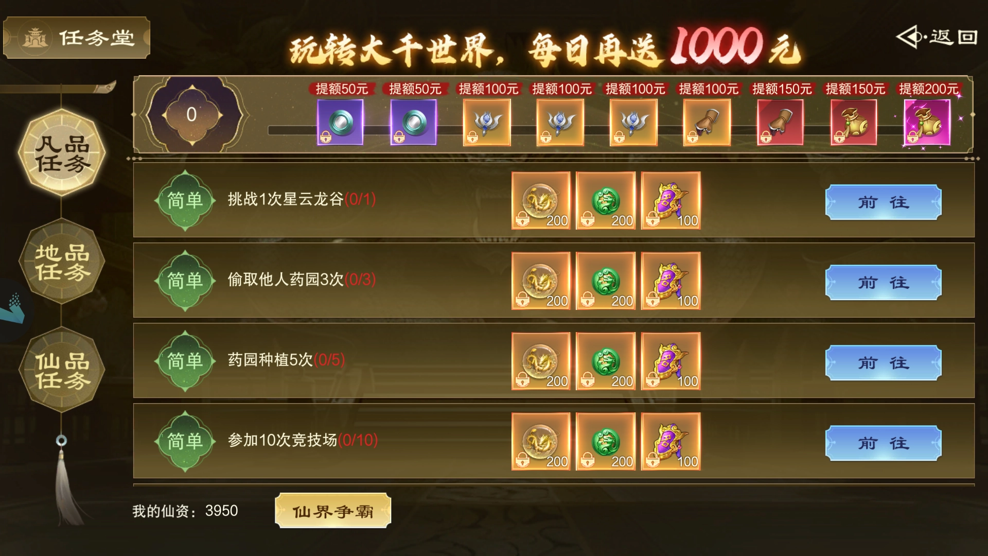 任务分为凡品、地品、仙品三个档位,难度依次由易至难。
