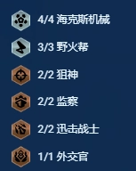 4个海克斯成员、3名野火帮成员、2位狙神、2个监察人员、2名迅击战士、1位外交官