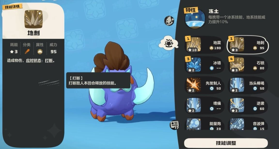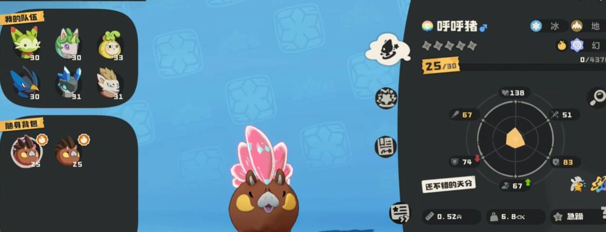 当呼呼猪进化成獠牙猪后,其技能体系主要围绕冰与地属性展开。主输出技能推荐带上暴风雪(冰系群体攻击技能,威力120,还能附带冰冻效果)以及地刺(土系单体攻击技能,威力100),暴风雪可用于群体控场,地刺则针对高防御的单位。辅助位可选择冰墙(威力55,能减速敌人)来进行控制。在第四技能槽,建议配置神秘力量(能提升抗性并免疫异常状态),以此构建攻防一体的体系。需要注意的是,特性激活至少要携带两个冰系技能,所以不建议替换暴风雪或冰冻之风。当面对水系或土系敌人时,开场先释放冰冻之风降低敌方群体速度,接着使用暴风雪触发冰冻控制。要是遭遇机械系或火系等高威胁目标,优先用车裂进行单体爆发输出。