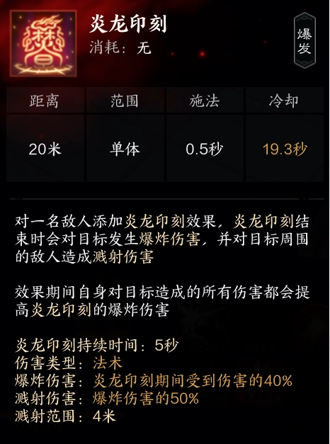 (2)技能炎龙印刻,对目标进行5秒标记,标记结束时会产生爆炸伤害,该伤害值依据5秒内目标所受伤害总量的百分比来计算。因此,释放完炎龙印刻后,应尽量多使用轰炎技能。例如,可以在炎龙印刻后紧接着使用爆发技能意气风发,然后疯狂砸轰炎;也可以在平稳期积攒到一定数量的玄火珠后,再用炎龙印刻配合砸轰炎;还可以在炎龙印刻后衔接法宝技能。