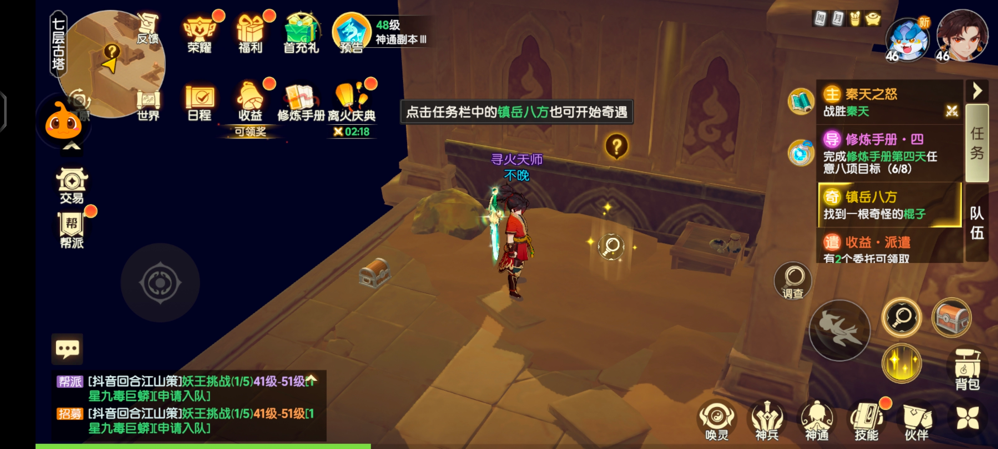 在任务栏中点击【镇岳八方】,同样能够开启奇遇。