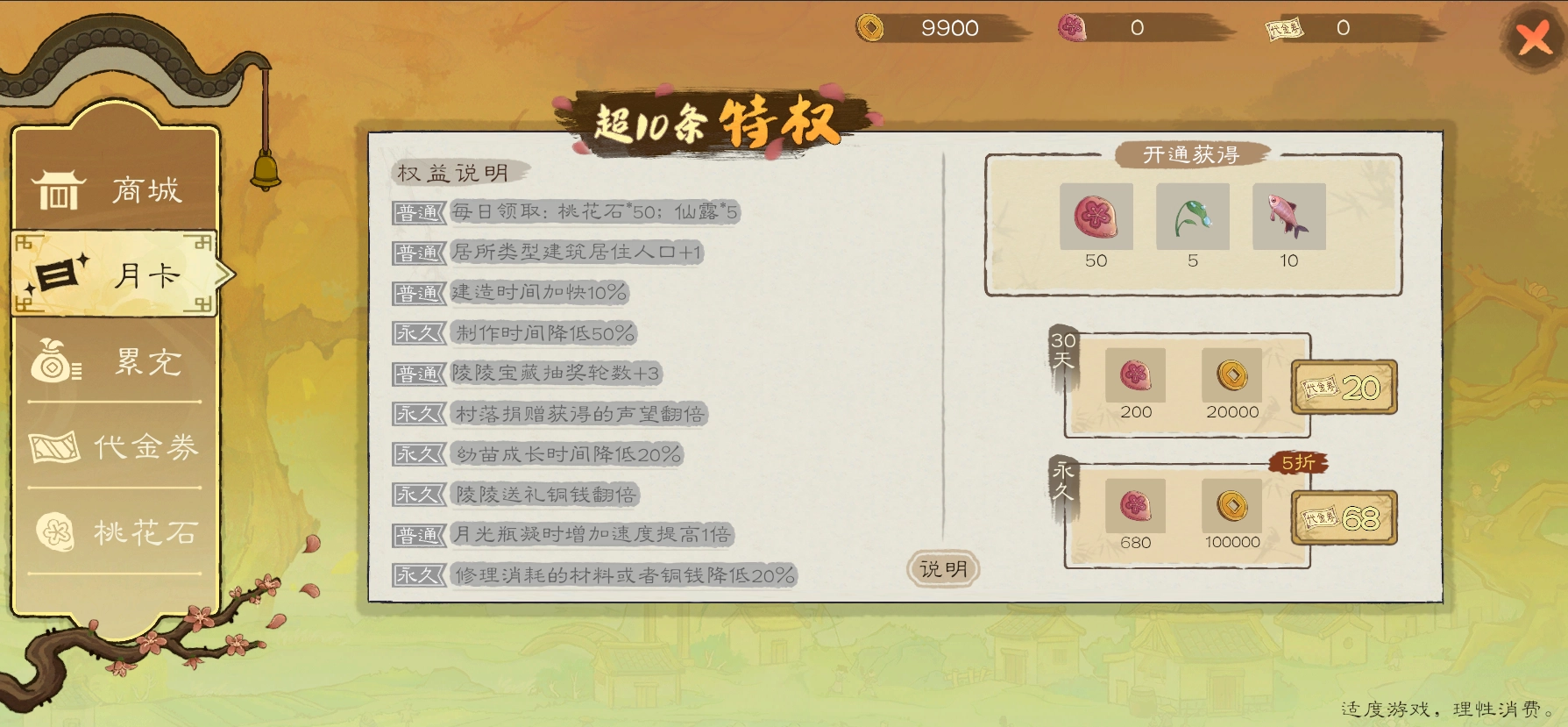 1、月卡及永久月卡(月卡20,永久月卡68)
