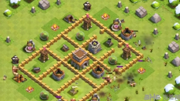 2、于五点方向派出胖子清除炮台,再补充几个野蛮人与弓箭手。在六点钟方向出动胖子和炸弹兵,以解决下方的炮塔。