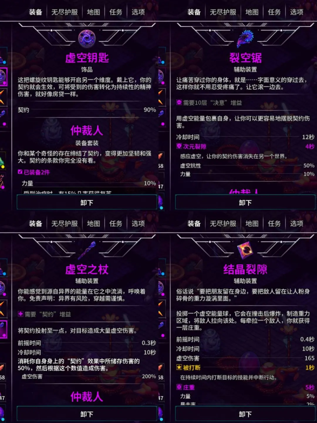触发原理为:虚空锤原地持续输出,提升契约伤害并叠加层数,以此触发法杖与裂空效果。钥匙负责缓存所受伤害,裂空则延迟伤害生效时间,最后借助法杖将累积的伤害释放出去,从而造成高额的远程单体伤害。