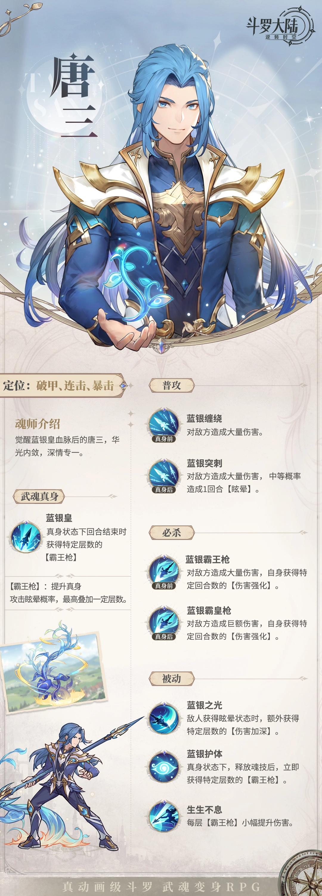 唐三在游戏里的定位为破甲、连击与暴击,是一位极为优秀的输出型选手。其自身普攻在真身出现前是蓝银缠绕,会对敌方造成伤害,待真身出现后则进化成蓝银突刺,不仅能造成高额伤害,还会使敌方陷入一回合的眩晕状态。唐三自身的武魂真身是蓝银皇,处于真身状态时,每回合结束之际都会获取霸王枪层数,每层霸王枪都可提升攻击触发眩晕效果的概率。