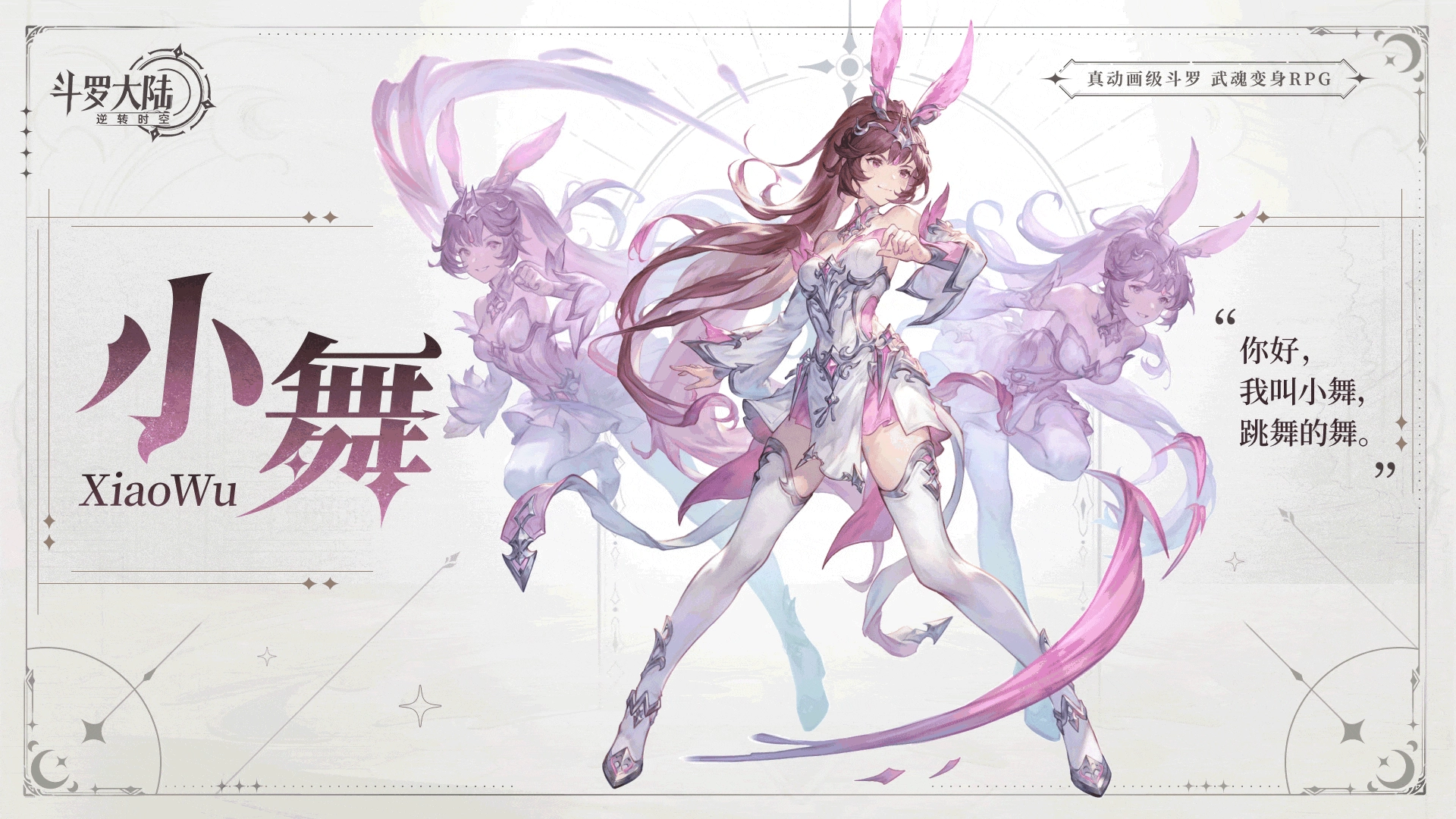 小舞乃是十万年魂兽柔骨兔通过重修化形成人,作为初代史莱克七怪的一员,年龄上排行老五,有着“柔骨魅兔”的外号。于《斗罗大陆:逆转时空》中,小舞在战斗里承担着控制战局与提升伤害的定位。一旦开启武魂真身,便能显著地提升对敌方造成的额外伤害。一连串的连击往往打得敌人毫无防备,小舞姐简直太飒啦!