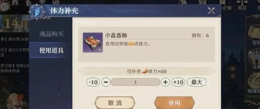 3、另外一种方式是“每日购买”,通过消耗相应材料来兑换体力。可以用一定数量的魂晶购买香肠,每根香肠能直接恢复60点体力。至于能购买多少香肠,一方面要看拥有多少魂晶,另一方面,每个人都有对应的购买上限。