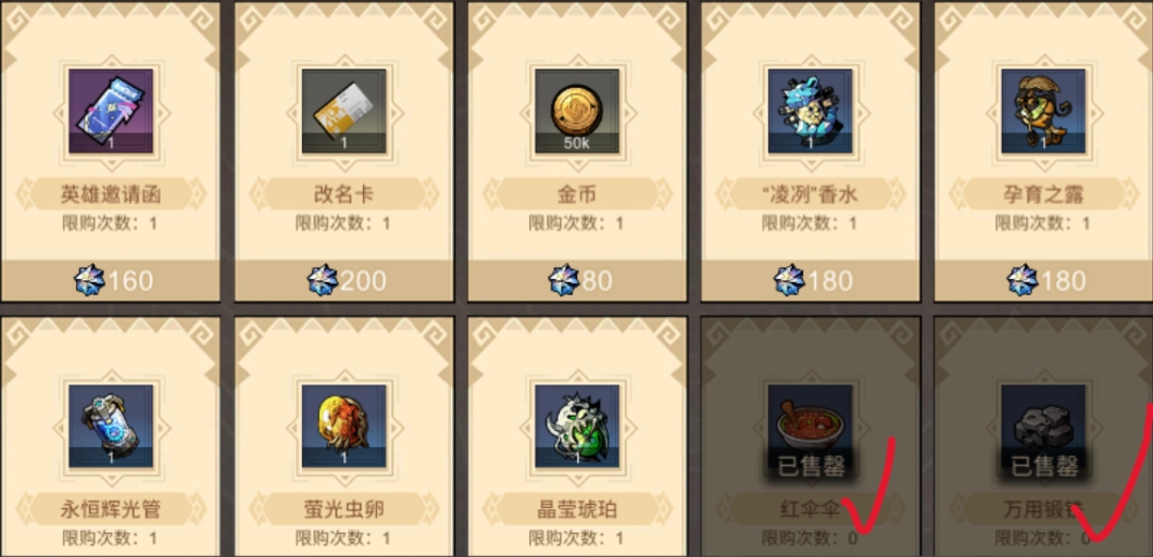 图4中打勾的商品一定要买,红伞伞这类商品得全部购入,其性价比相当于80钻能买100体力,相比直接购买体力(图5中显示200钻买200体力)要更划算。矿石的价格也很实惠,直接全部拿下就行。