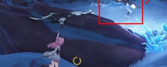2、从平台边缘纵身跃下并打开滑翔伞,接着调整视角,于盘龙崖的下一层平台处,就能看到声骸叮咚咚。