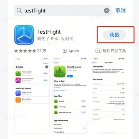 于App Store内搜索TestFlight,寻得TestFlight应用后,点击“获取”来下载并安装该应用。