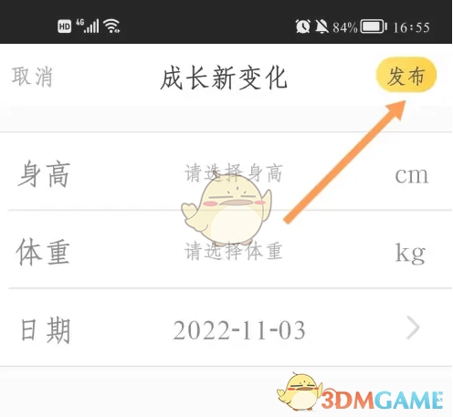 3、当您进入【成长新变化】记录页面,在此页面输入孩子的身高与体重信息,随后点击页面右上角的【发布】按钮,完成上述操作后,即可成功记录孩子的成长新变化。