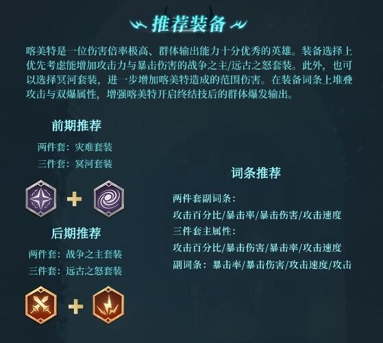 喀美特是一名伤害倍率极高且群体输出能力极为出色的英雄。在装备挑选方面,优先考虑能提升攻击力与暴击伤害的战争之主或远古之怒套装。除此之外,冥河套装也是不错的选择,它能够进一步提高喀美特造成的范围伤害。在装备词条上,应着重堆叠攻击与双爆属性,以此强化喀美特开启终结技后的群体爆发输出能力。
