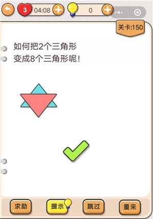 在第150关里,玩家要进行三角形的组合,需把2个三角形变成8个。乍一听,这简直不可思议,似乎根本无法做到。然而,要是玩家能静下心深入研究,就会发觉达成这个条件并非没有可能。接下来,就为大家讲解这一关的通关攻略,一起来看看吧。