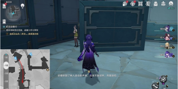 第三名逃犯在幽囚狱 -3 层,需从传送锚点启程,借助换境画屏抵达电梯周边,接着折回到阶梯机关位置;把阶梯机关设置为向上状态后,经由阶梯前往上层,对附近的箱子展开调查。