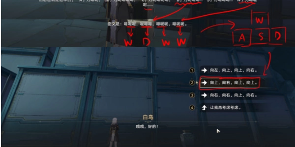 回到碰见机巧鸟的地方,按照机巧鸟提供的密文与密钥(有一种邦布的既视感……),对文字进行解密,然后根据解密后的文字向机巧鸟下达指示。