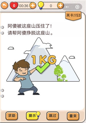 在游戏的第153关里,玩家要助力阿傻摆脱压在他身上的山,这任务看似困难重重,毕竟这座山重达1吨。不少玩家或许都不知该如何帮阿傻挣脱,下面就为大家讲解具体方法,快来瞧瞧吧。