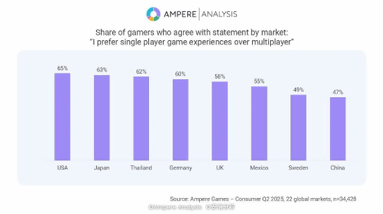根据安培的数据,美国有65%的游戏玩家更青睐单人游戏,这让美国成为单人游戏玩家占比最高的国家。排在它后面的依次是日本(63%)、泰国(62%)和德国(60%)。而英国玩家中偏好单人游戏的比例稍低一些,为58%。