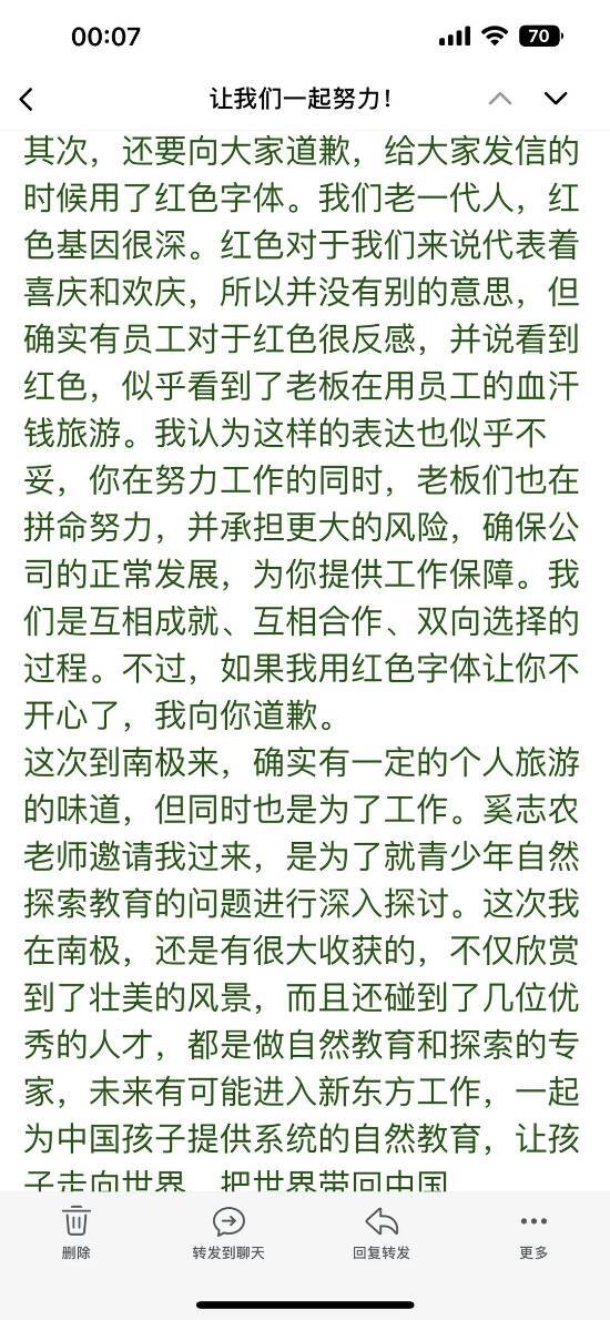 俞敏洪首先向员工致歉,说明自己写信时身处南极,故而用了些南极相关的描述与比喻,没想到引发部分员工不满,强调自己绝非借此炫耀在南极的经历,而是始终希望能真诚地和大家分享自己的观点与近况。他认为:“一个愿意和大家分享的老板,总比一个神秘的老板更能让员工放心、安心。”