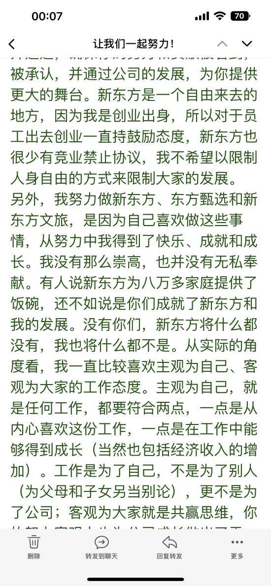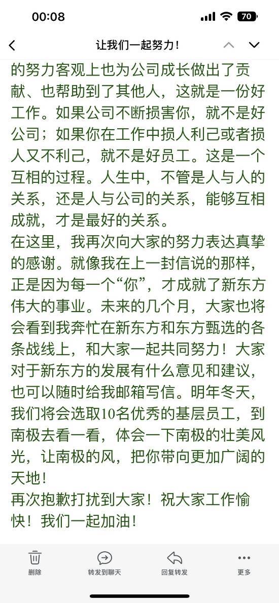 未来的几个月,大家也将会看到我奔忙在新东方和东方甄选的各条战线上,和大家一起共同努力!大家对于新东方的发展有什么意见和建议,也可以随时给我邮箱写信。