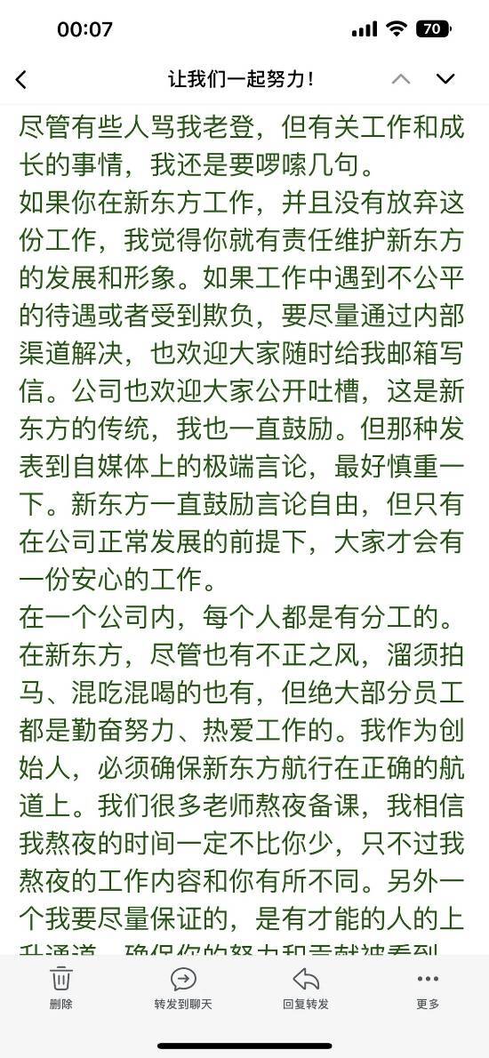 而在昨日深夜23点多,俞敏洪又写了一封主题为“让我们一起努力”的全员信,再次向员工道歉,并详细解释了自己写信的缘由和初衷。