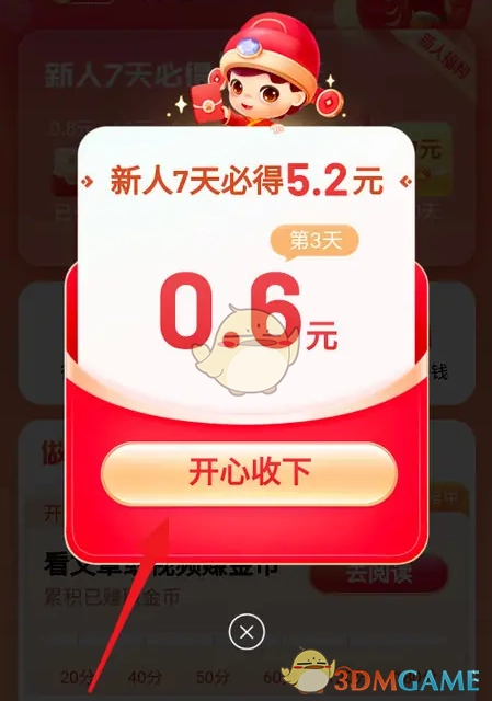 3、签到成功后,点击“开心收下”即可,具体位置如图所示。
