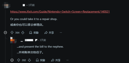 帖主称,陪伴自己八年的Switch被侄子弄坏了,感觉今年的运气算是到头了。帖主这段倒霉的遭遇引来了不少看热闹的网友,其中大部分人调侃道:“换一个呗,不过我说的是侄子。”也有一些暖心的网友给出建议,说赶紧拿去修说不定还能挽救,当然最好是把维修账单甩给侄子。
