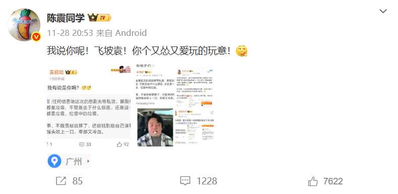 陈震一看就知道是在说自己,破防回怼。不光骂袁启聪“又怂又爱玩”,还翻出对方的黑历史,喊人家“飞坡袁”,两位大 V 就这么隔空掐了起来。
