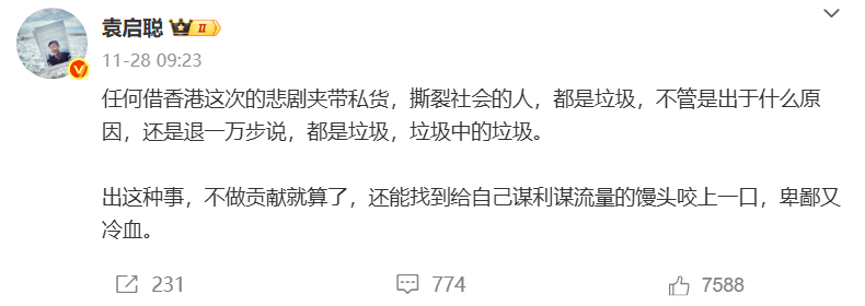 平心而论,这完全是两码事。小米集团自身的负面舆论再多,陈震也不该借着灾难事件玩梗,还通过小米公益的事来蹭热度。本来陈震装模作样道歉,说自己“表达不够清楚”,这事差不多就能过去了,可另一位流量大V袁启聪却站了出来——他虽然没直接点名字,但话里的指向性特别明显,直言“不管出于什么缘由,凡是借着悲剧夹带私货、挑动社会对立的人,都是渣滓”。