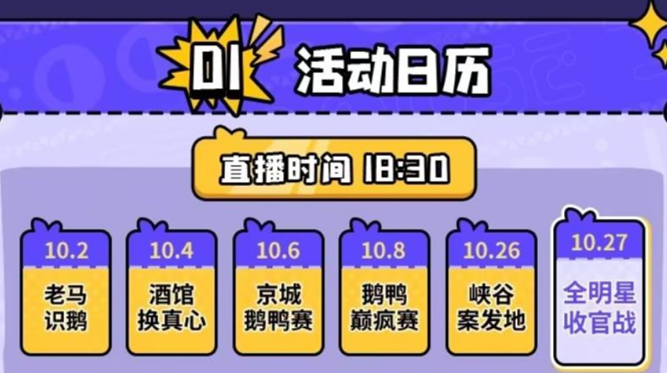 《鹅鸭杀》的“鹅斯卡之夜”直播活动将在10月2日到10月27日期间开展,每晚18:30都会准时和大家碰面。活动期间,我们会为大家呈现一系列精彩有趣的内容,下面是小编整理的详细信息,感兴趣的玩家可以来了解一下!