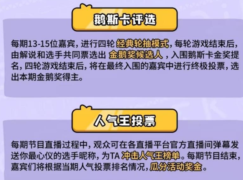 每期活动会邀请13至15位嘉宾,共同参与四轮经典轮抽模式的游戏。每一轮游戏结束后,解说与选手将联合票选金鹅奖候选人,这些候选人将获得鹅斯卡金奖的提名资格。待四轮游戏全部结束,会从最终入围的嘉宾里开展终极投票,以此确定本期金鹅奖的获得者。
