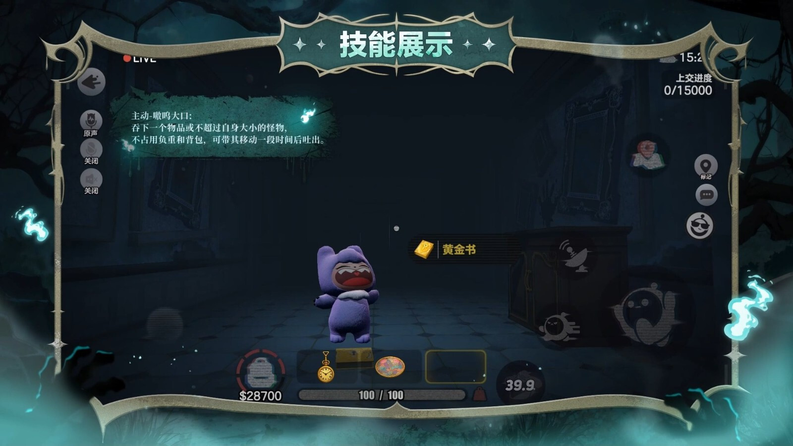 主动-嗷呜大嚼:将一个物品或体型不超过自身的怪物吞入腹中,该吞入物不占用负重与背包空间,可携带其移动片刻后再吐出。