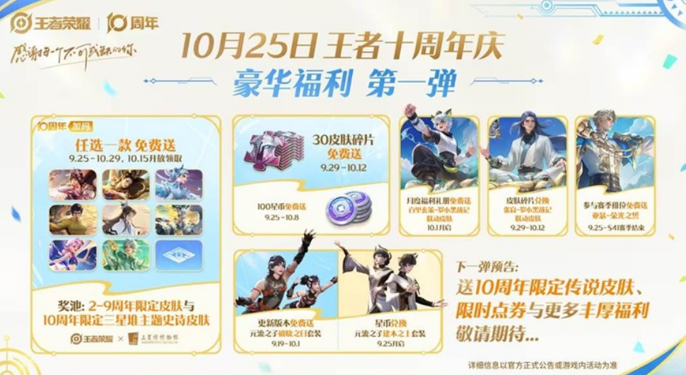 2-9周年限定皮肤与10周年限定三星堆主题史诗皮肤任选一款免费赠送:活动正火热开展,玩家可在9月25日至10月29日期间,以及10月15日开放领取时段,挑选一款心仪的皮肤免费收入囊中。特别提示,10周年限定史诗皮肤在活动结束后将上架商城限时出售,想要免费获取的玩家务必不要错过!