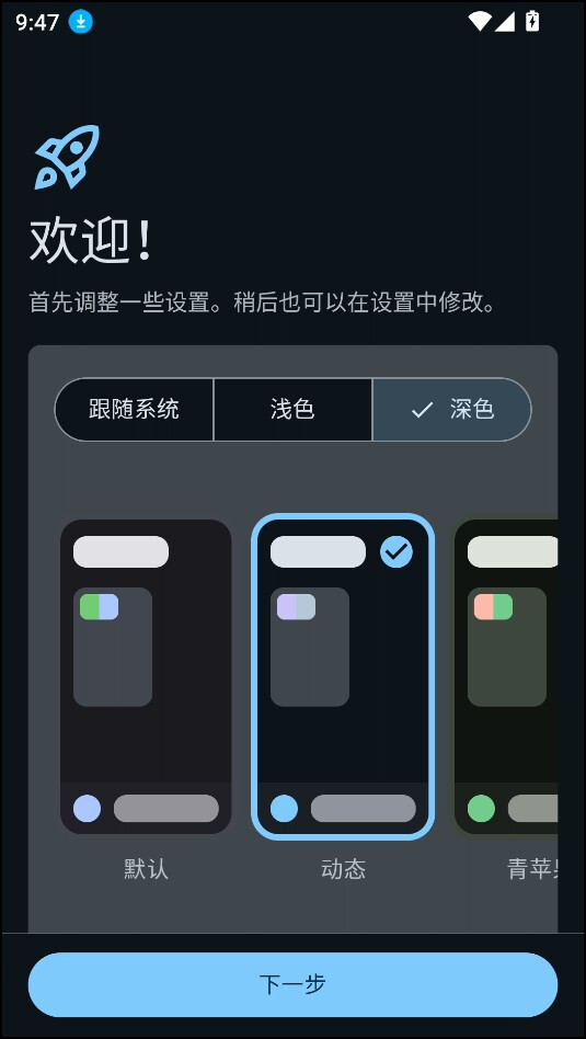 1、第一次打开软件时,需要完成一些基础设置操作:先挑选一个你钟爱的主题样式,接着点击“下一步”按钮继续。