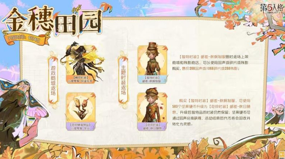 暑气渐渐褪去,秋意日益浓厚,《第五人格》充满丰收气息的全新主题活动“金穗田园”已正式开启!本次活动围绕田园秋收展开,准备了多样的活动内容、限定奖励和返场福利,让玩家在游戏里体验秋日氛围的同时,也能收获属于自己的丰厚成果!