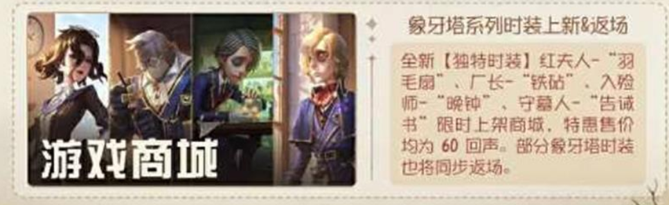 以下是修改后的文本:本次推出的商品均限时上架,每件售价60回声;此外,部分经典的象牙塔系列时装也将同步开启限时返场活动!