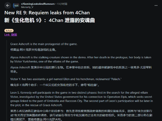 近日,社交平台4chan上有用户透露了《生化危机9》的最新动态,其中不少游戏相关信息与游民星空此前发布的另一则爆料存在一定联系,下面就让我们来了解一下具体内容。