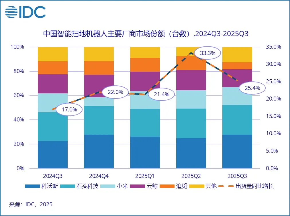 1IDC于12月5日最新发布的《全球智能家居设备市场季度跟踪报告》指出,2025年全球智能扫地机器人市场将延续强劲增长态势,行业竞争格局也将迎来深度调整。值得关注的是,全球市场出货量前五的厂商均为中国品牌,这一现象充分表明中国在该领域的供应链与技术已确立绝对领先地位。
