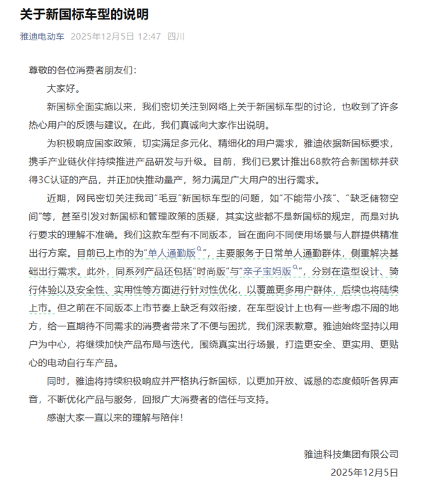 今日,雅迪电动车官微发布关于新国标车型的说明,向消费者致歉。