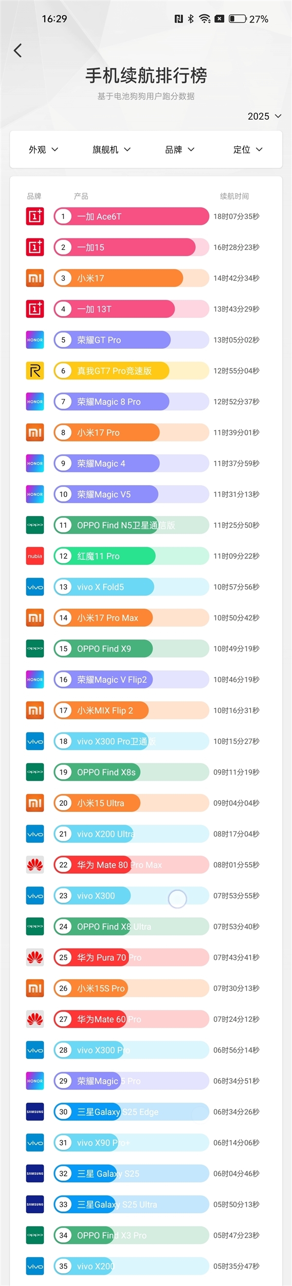 值得一提的是,旗舰机榜单的亚军也来自一加,正是其主打旗舰机型一加15,凭借7300mAh的电池容量,取得了16小时28分23秒的续航成绩。