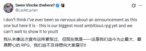 我从未像这次宣布时这般紧张,但此刻就是了——这是我们到目前为止规模最大、最富野心的RPG作品,我们已经迫不及待想向大家展示了!!